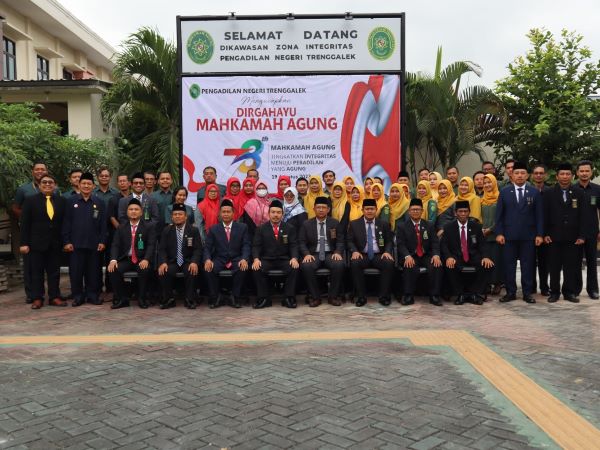 Sabtu, 19 Agustus 2023 Pengadilan Agama Trenggalek bersama Pengadialan Negeri Trenggalek mengadakan upacara memperingati hari ulang tahun Mahkamah Agung RI ke-78 yang bertempat di halaman kantor Pengadilan Negeri Trenggalek. Upacara yang diikuti oleh para Hakim, Pejabat Struktural maupun Fungsional dan juga seluruh Pegawai dan PPNPN dari kedua satker Mahkamah Agung yang berada di Kabupaten Trenggalek ini, dihadiri pula oleh beberapa Pensiunan warga Pengadilan Negeri Trenggalek yang bertempat disekitar Trenggalek. Upacara yang mengusung tema “Tingkatkan Integritas Menuju Peradilan yang Agung.”