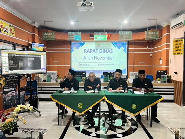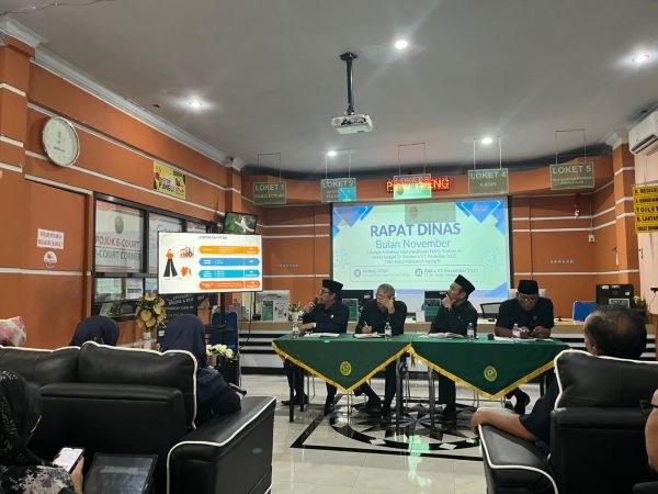 Trenggalek, 05 November 2025 — Pengadilan Agama Trenggalek melaksanakan Rapat Dinas Bulan November 2025 yang bertempat di Ruang Pelayanan Terpadu Satu Pintu (PTSP). Kegiatan rutin ini dihadiri oleh seluruh aparatur Pengadilan Agama Trenggalek, mulai dari pimpinan, pejabat struktural dan fungsional, hingga staf kepaniteraan dan kesekretariatan. Rapat dibuka secara resmi oleh Bapak Panitera Pengadilan Agama Trenggalek, yang menyampaikan apresiasi atas kinerja seluruh pegawai serta mengingatkan pentingnya sinergi antarbagian dalam memberikan pelayanan terbaik kepada masyarakat pencari keadilan.